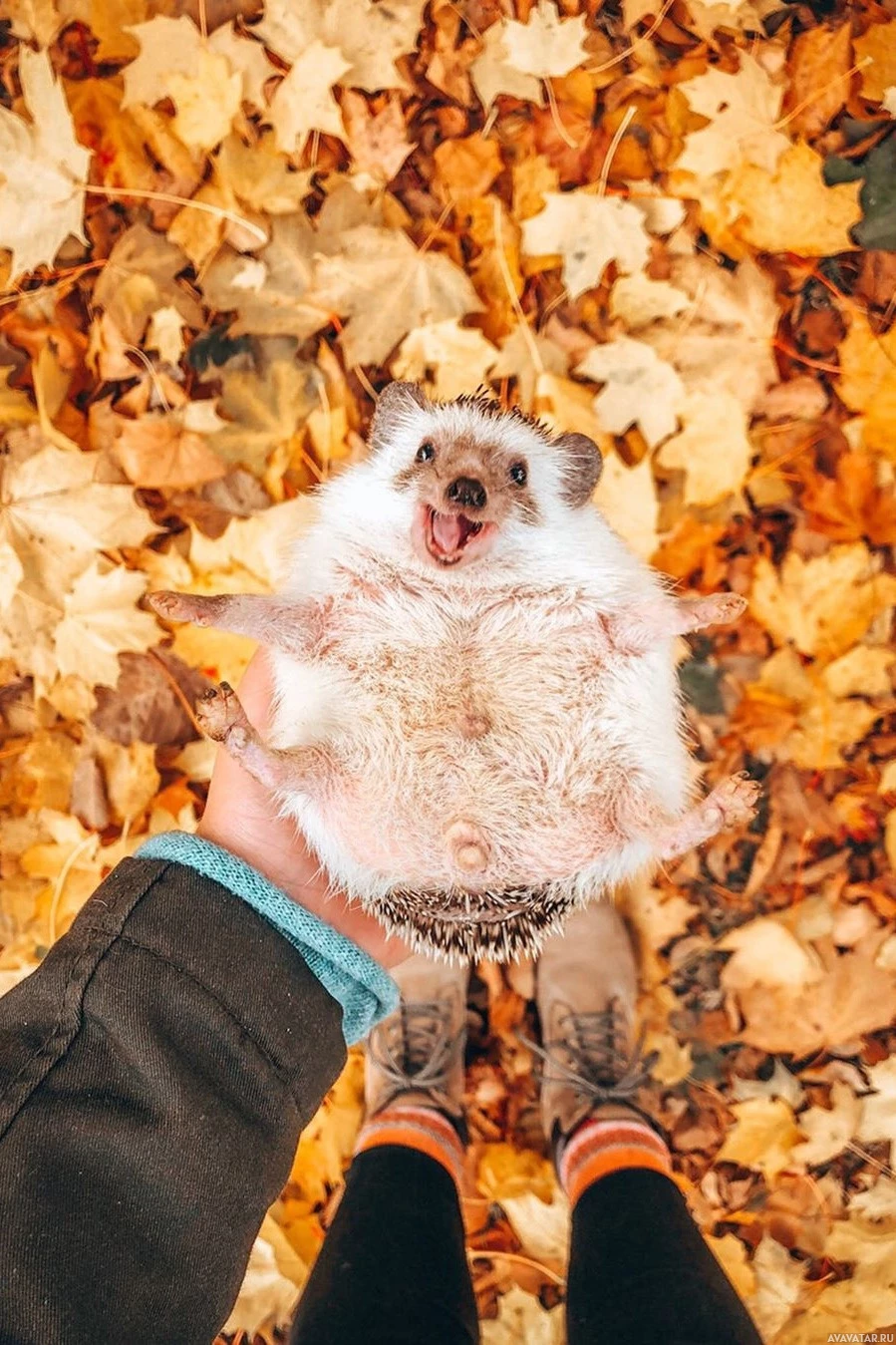 The picture shows a hand holding a hedgehog with a vibrant, multicolored coat of fur that resembles autumn leaves. The background is filled with fallen autumn leaves, which indicates an autumn season setting. The hedgehog appears to be smiling or making a happy expression.