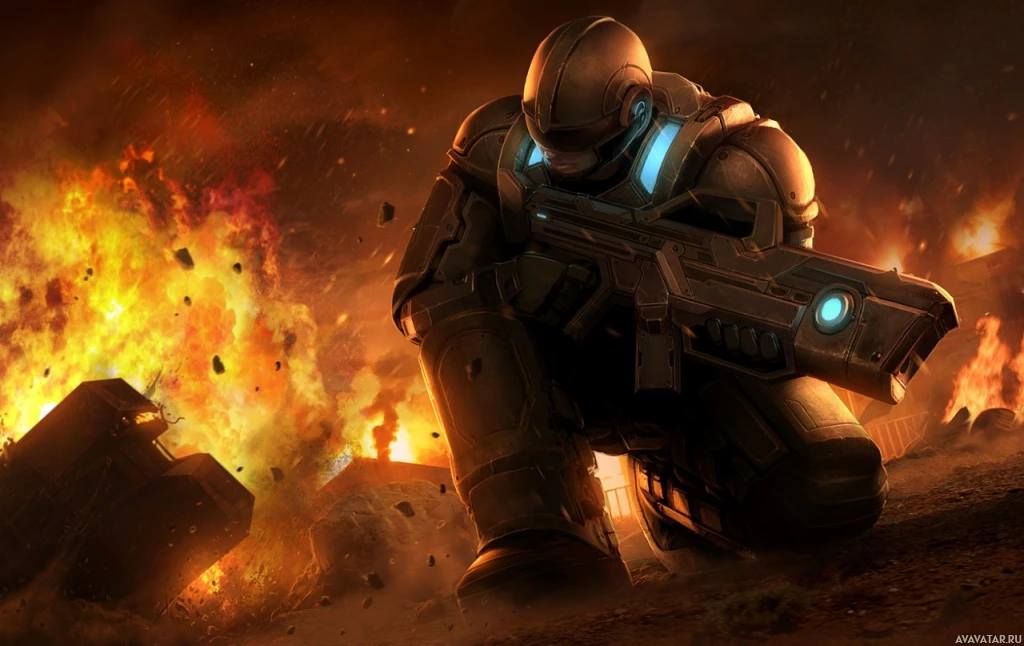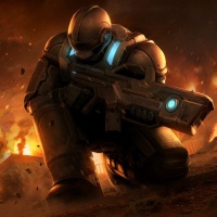 a science fiction scene featuring an armored soldier with a weapon. The soldier is in the foreground and appears to be crouched, likely preparing for or engaged in combat. In the background, there are explosions and flames, indicating some sort of conflict or battlefield situation. The setting seems to be outdoors, possibly on a planet with