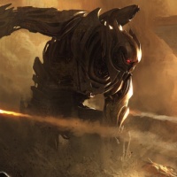a science fiction scene featuring a robot in the foreground. The robot appears to be heavily armored and is holding a weapon that emits a bright, concentrated