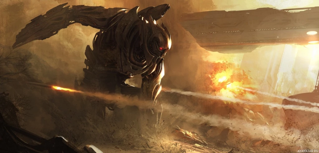 battle scene with smoke or dust, indicating conflict or destruction. This setting suggests a war scenario where