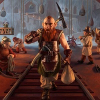 a fantasy scene with a dwarf character in the center. He is standing on a wooden platform that appears to be part of