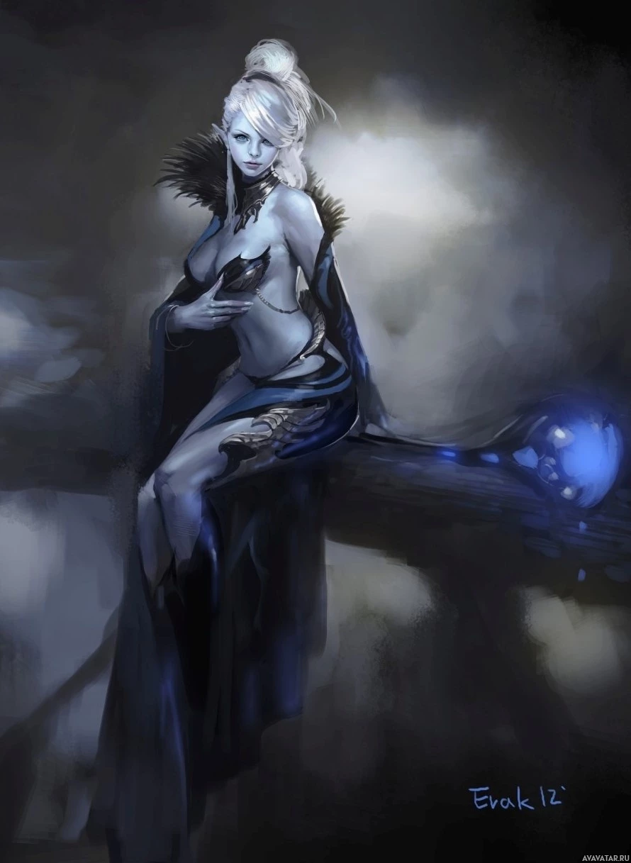 white hair and is dressed in attire reminiscent of the Drow, which are a fictional race in Dungeons & Dragons lore known for their dark skin,