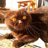 yellow eyes, which are likely due to the lighting conditions in the photo, possibly from sunlight or artificial light illuminating the cat's pupils. It appears to be indoors, given