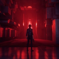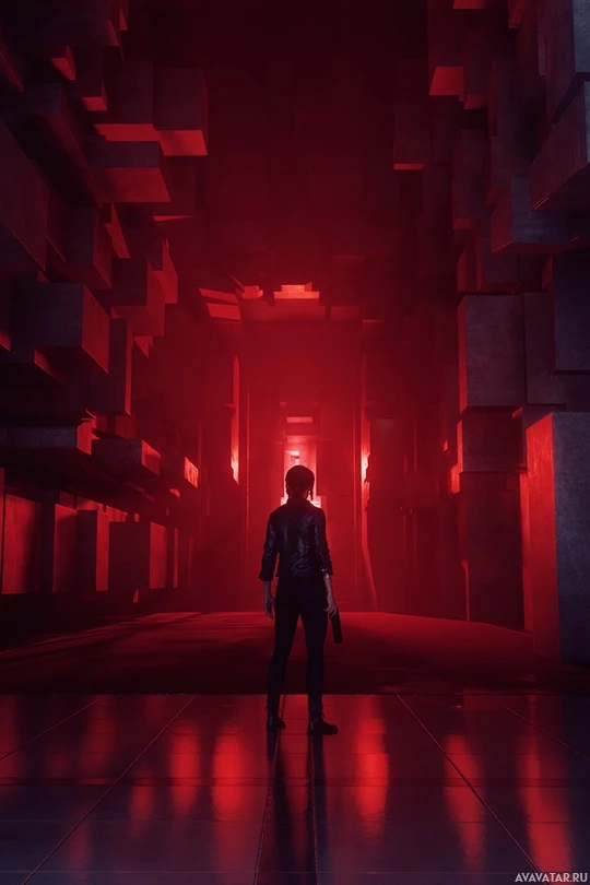 a video game, featuring an in-game character who appears to be a girl standing with her back to the viewer. She is equipped with a pistol and is situated within what looks like a corridor or tunnel of some sort. The environment has a red and black color scheme, which gives it a moody and intense atmosphere. The perspective suggests that the player might be looking over the character's shoulder at this