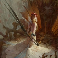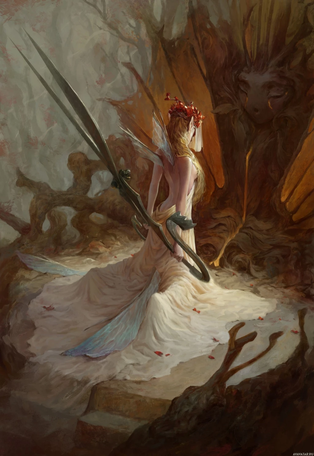 a fairy with wings and a scissor-like weapon she is holding in her right hand. She has a flowing dress and is standing on what looks like