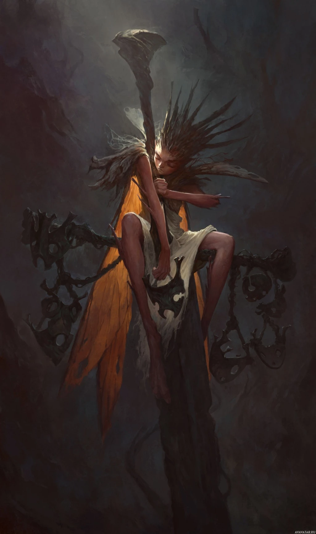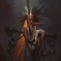 ominous surroundings, and they are holding what seems to be an object that could be a staff or wand. The art style has a gothic or grim atmosphere, with attention to detail in the rendering of light and shadow.