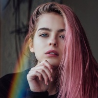 a young woman with pink hair. She appears to be indoors and is looking slightly away from the camera, creating a contemplative or thoughtful mood. Her hand is resting on her chin, suggesting she may be deep in thought. There's a rainbow-colored