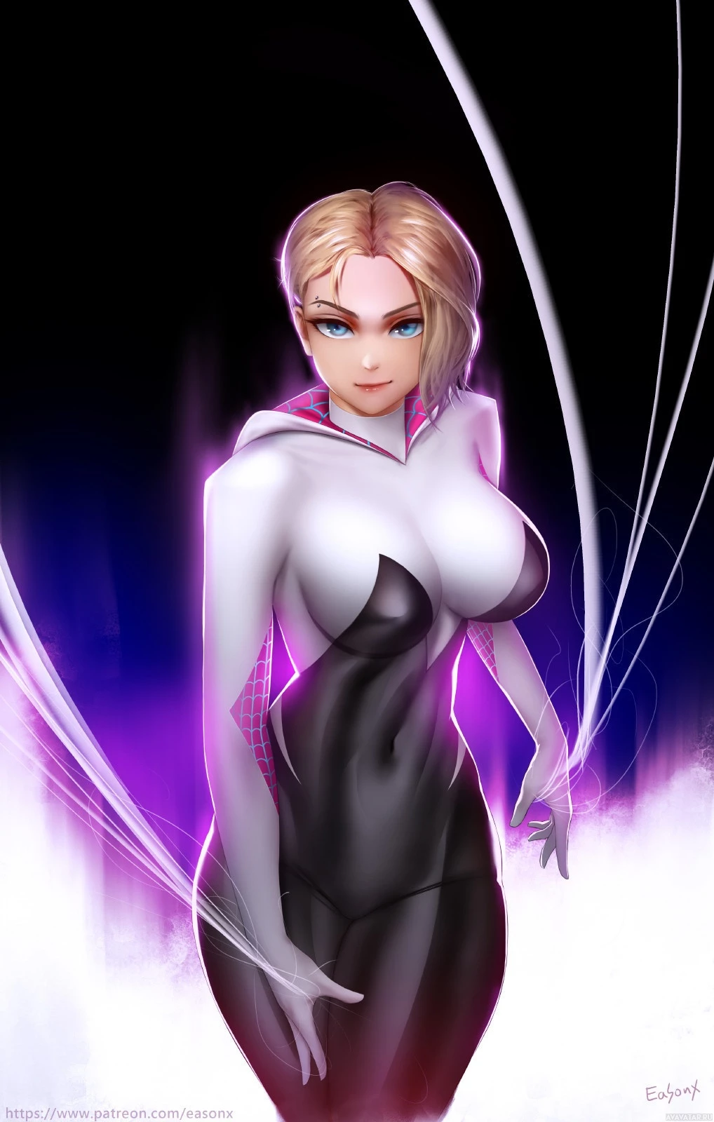 Gwen costume, which includes a black and white bodysuit with spider motifs and a purple cape. The background suggests