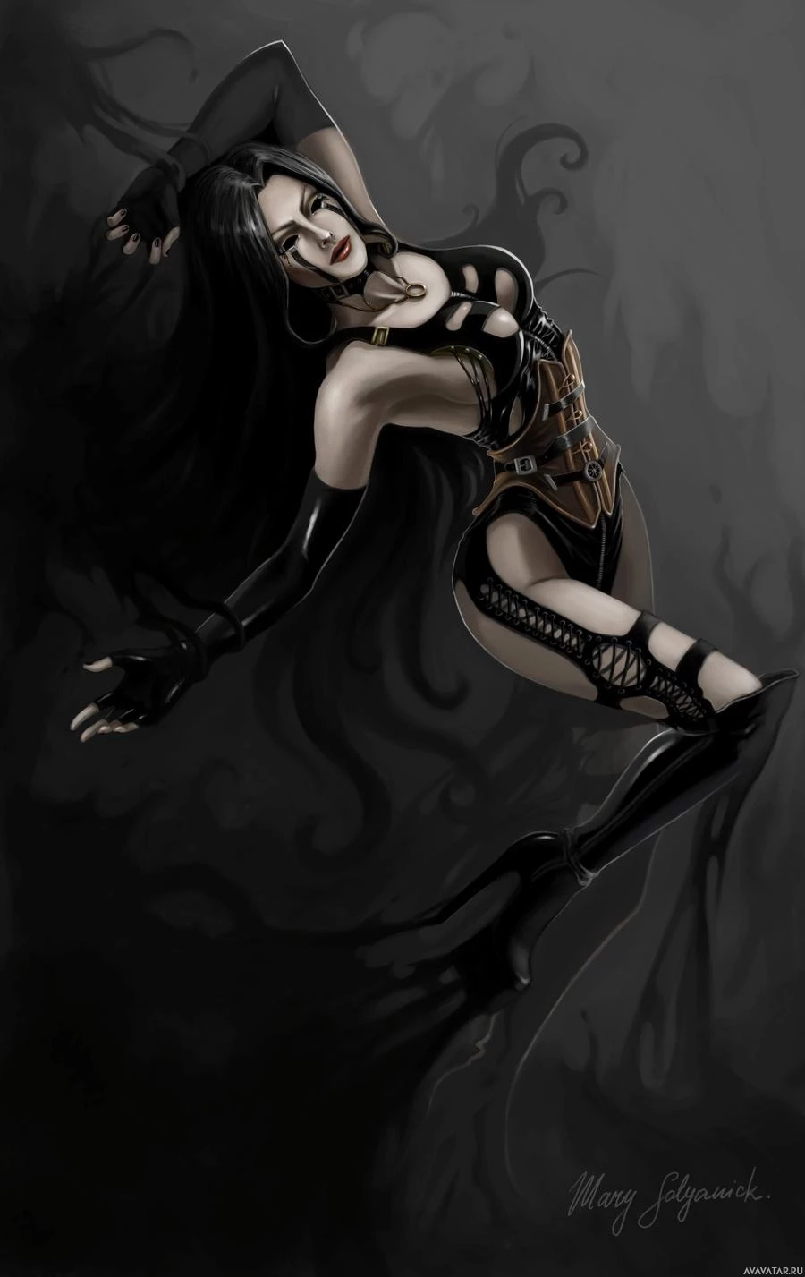 female character with dark hair, wearing what appears to be a dark and intricate costume or armor. She is posed in an dynamic way, giving