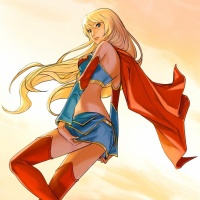 The image depicts a female character with blonde hair and blue eyes. She is wearing a costume that includes a cape, red boots, and a skirt with wings. This character is likely inspired by superheroines from comic books or animated series, such as Supergirl.