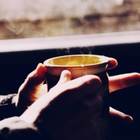 The image shows a person holding a cup and enjoying a beverage, possibly tea or coffee. This action is often associated with relaxation or contemplation. It's