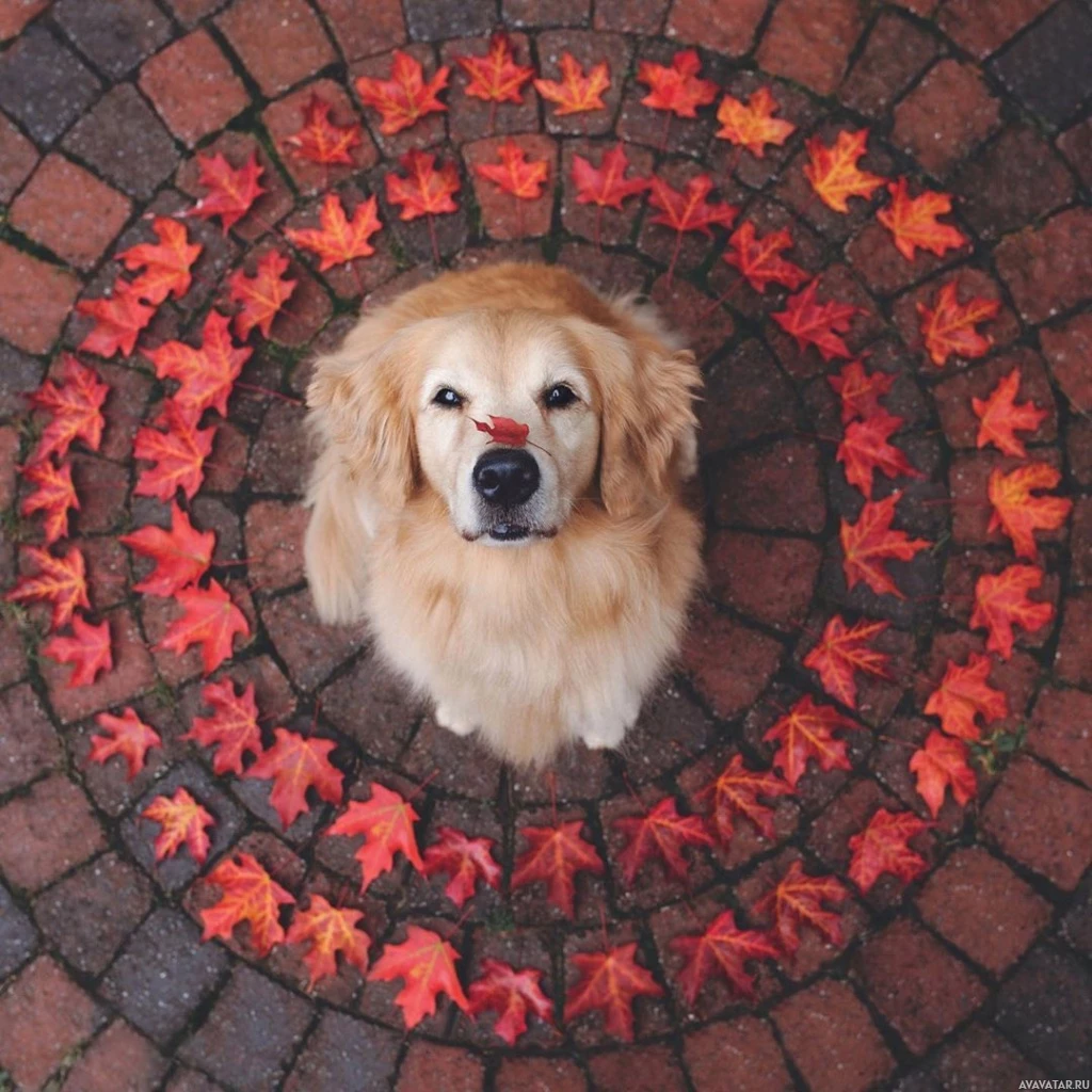 a circular pattern made from red leaves. The dog is looking directly at the camera with its tongue out, giving a playful and relaxed expression. The scene appears to be autumn-themed due to