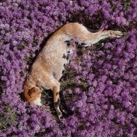 The image shows a dog lying on its side among purple flowers, possibly lavender or similar type of plant. The dog appears to be resting or perhaps even sleeping, given the relaxed posture and closed eyes.