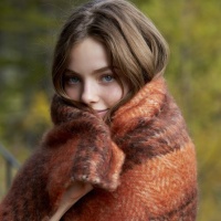 The image shows a young woman or girl wearing a fur coat. She appears to be outdoors, as suggested by the natural surroundings. Her expression is gentle and she seems to be posing for the photograph.