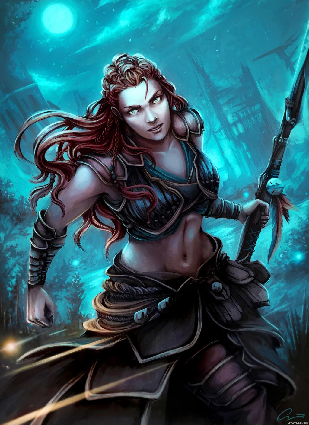 red hair and is wearing a fantasy-style armor with a skirt and a breastplate, suggesting she might be a character from a role-playing game, a book series, or a comic book. In her hand, she holds a spear, which is often associated with warriors in