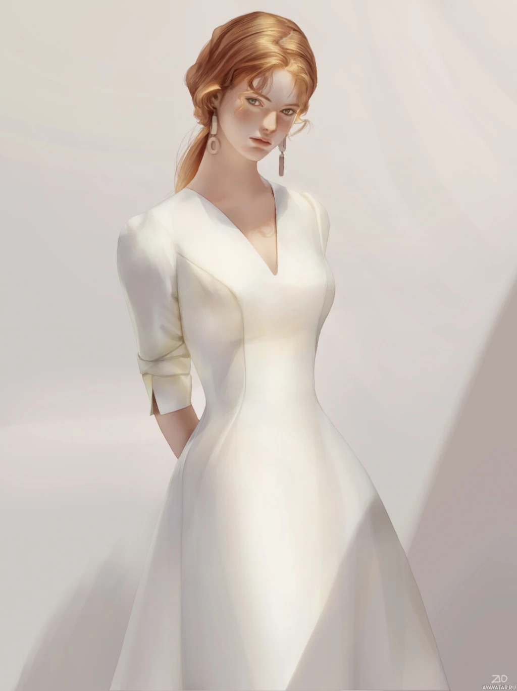 a white dress with long sleeves and a V-neckline. Her hair is styled in loose curls, and she appears to have