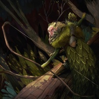 The image depicts a fantasy scene featuring an elf character. The elf is standing in what appears to be a jungle or forest setting, holding a bow and arrow. It has pointy ears and is adorned with a green outfit that blends into the natural surroundings. The background is richly detailed with various foliage and greenery, contributing to the fantasy atmosphere of the image.