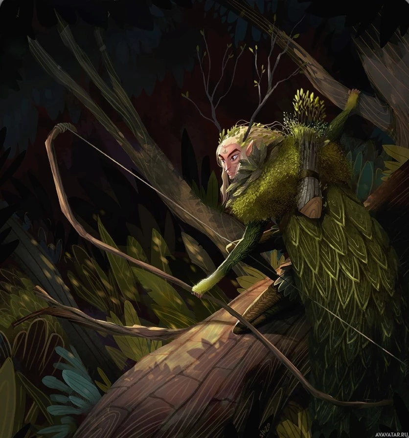 На картинке изображена фантастическая сцена с участием эльфа. Эльф стоит посреди чего-то похожего на джунгли или лес, держа в руках лук и стрелы. У него заостренные уши, и он одет в зеленую одежду, которая гармонирует с окружающей природой. Фон богато детализирован разнообразной листвой и растительностью, что придает изображению фантастическую атмосферу.