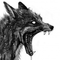 a dynamic pose, with its mouth open as if growling or howling, and its fur is depicted with rough strokes that give it a somewhat wild and intense appearance. The artwork conveys