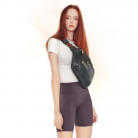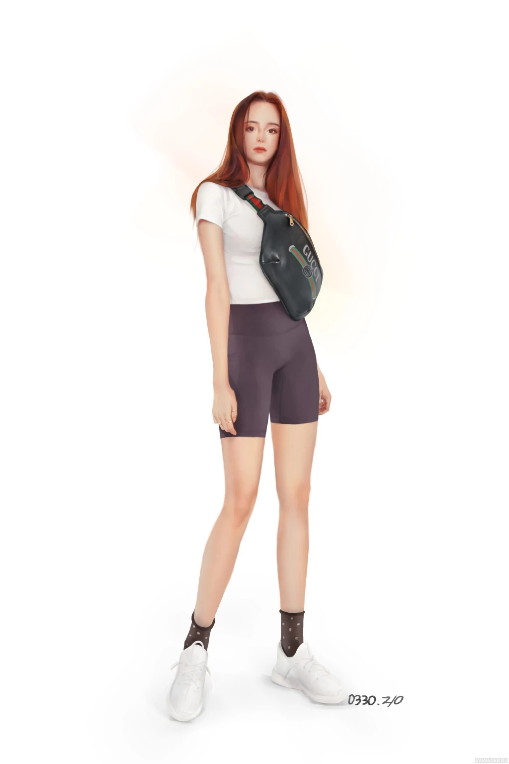 На изображении вы можете увидеть 3D-модель женского персонажа. У нее рыжие волосы и спортивная одежда, состоящая из шорт, топа и спортивной обуви с носками до щиколоток. На верхней части ее тела также видна поясная сумка. Освещение на изображении кажется мягким, что создает приятную атмосферу.