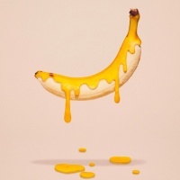 На картинке изображен банан, с которого стекает желтое вещество, напоминающее мед или сироп. Это не реальный сценарий, а творческое воплощение, вероятно, созданное в художественных или коммерческих целях.