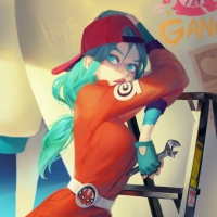 mechanical skills or interests. The character has a playful and confident expression as she looks towards the viewer.