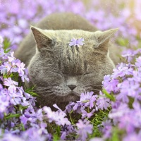 a gray cat peeking through a field of purple flowers. The cat appears to be looking at something directly ahead, possibly observing its surroundings or another object out of frame. The background is filled with the vibrant purple of the flowers, which stand out against the lighter shades that might indicate grass or a lighter