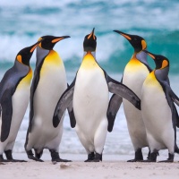 На картинке изображены четыре пингвина на песчаном пляже у океана. Кажется, что они стоят близко друг к другу и смотрят в одном направлении, возможно, наблюдая за чем-то или взаимодействуя друг с другом.