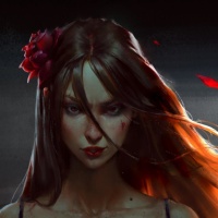 a black top and has a flower pinned to her dress. Her expression appears intense or serious, and she has some blood on the side of her face, suggesting she might be in a situation involving violence or danger. The background is dark, which contrasts with her vibrant