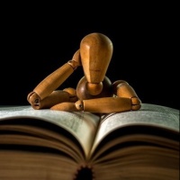 an open book that appears to be quite large, suggesting a theme of learning or education. The setting seems to be monochrome, with the background being black and white, which gives the image an artistic quality. The wooden man could also be interpreted as a representation of a statue or figurine often found in courtrooms as