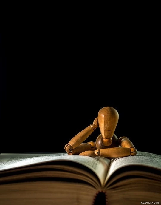 a wooden man with his hands placed on his head, seemingly deep in thought or possibly indicating confusion. He is sitting next to