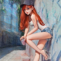 a casual stride or pause on a street. There are urban elements in the background like a wall and what appears to be a sidewalk, contributing to a street-like setting. The character's style is reminiscent of Japanese anime/