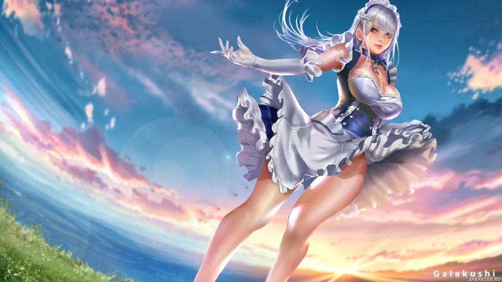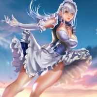white hair, dressed in what appears to be a maid or waitress outfit. The background features