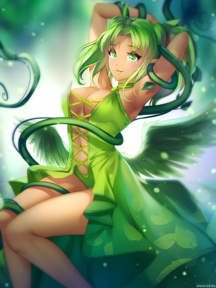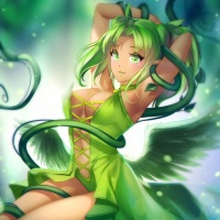 an illustrated character of a female with green hair and blonde highlights. She has wings sprouting from her back and is wearing a dress that appears to be made up of leaves or foliage, which gives the impression of being a fairy or
