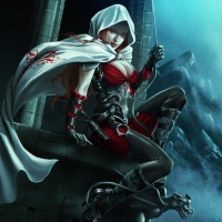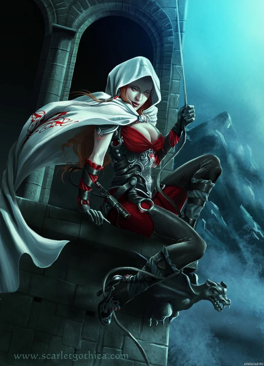 red hair, dressed in a hooded cloak and holding a bow. She is sitting on a rocky surface that looks like