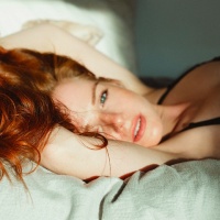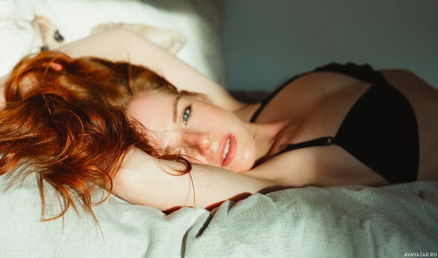 red hair and is wearing lingerie or intimate apparel, which suggests that she might be in a private, comfortable setting. Her expression is one of contentment or even anticipation, given the way she's looking upwards. The lighting and shadows give the image a warm, inviting quality, highlighting the woman's features and creating
