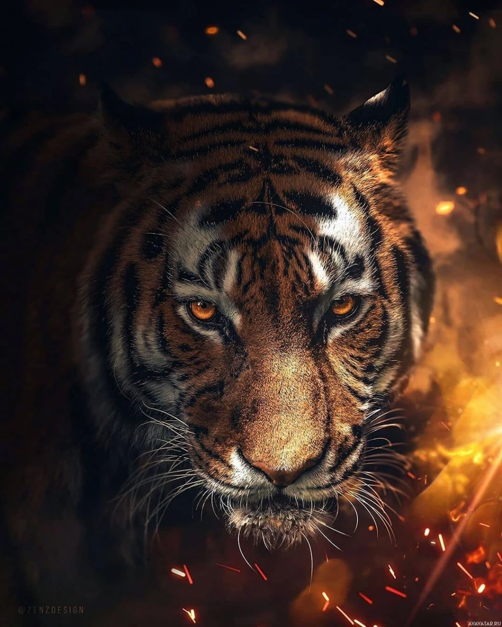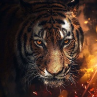 The image shows a tiger in a dynamic and fierce pose, with its mouth open as if roaring. Behind the tiger, there are flames or sparks, giving