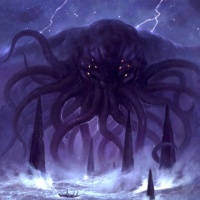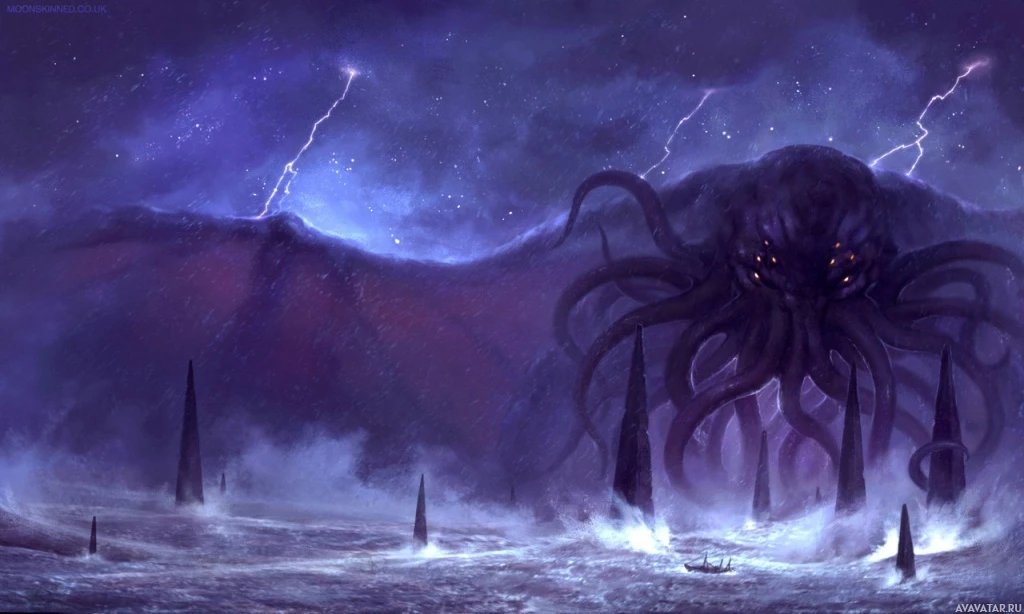a fantasy scene featuring an octopus-like creature, often associated with the Cthulhu mythos. This creature is surrounded by