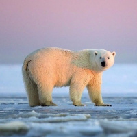 Картинка показывает белого медведя, стоящего на ледяной поверхности, вероятно, морского льда или замерзшей воды. Фон показывает небо во время того, что кажется либо рассветом, либо сумерками, учитывая мягкое освещение и цветовые градиенты в небе.