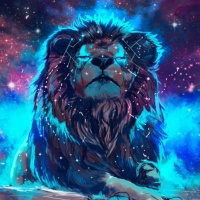 the celestial bodies such as the moon, stars, and nebulas creating an intricate backdrop that suggests a cosmic environment. The colors are vivid, with blues dominating the scene, which adds to