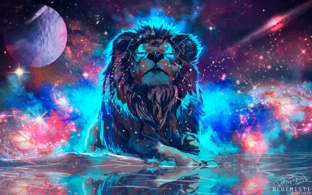The image features a lion depicted in a surreal and fantastical setting. The lion appears to be sitting or lying on a surface that resembles water, with