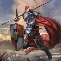 The image depicts a character dressed as a warrior from an era that could be interpreted as medieval or fantasy-inspired. This figure is wielding a lance and wearing armor, which includes a shield bearing a crest, suggesting they might be a knight or a similar