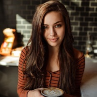 The picture features a young woman sitting at what appears to be a cafe. She is holding a cup of coffee, smiling gently towards the camera. The setting includes warm lighting and cozy decor, suggesting a comfortable and inviting atmosphere often found in cafes.