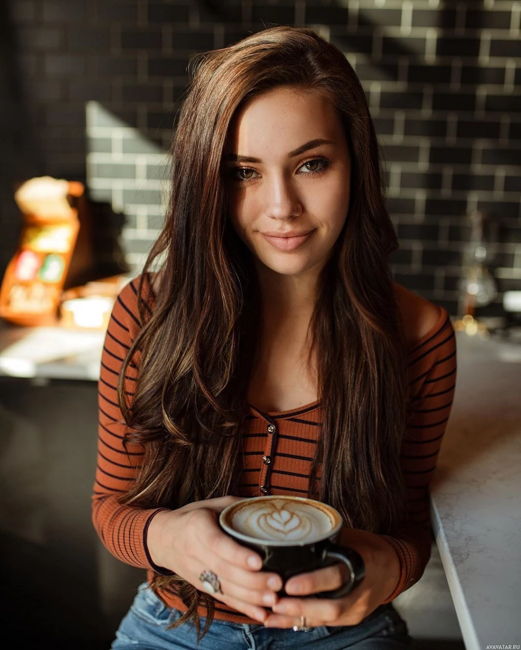 На картинке изображена молодая женщина, сидящая в помещении, похожем на кафе. Она держит в руках чашку кофе и нежно улыбается в камеру. Теплое освещение и уютный декор создают уютную атмосферу, которая часто встречается в кафе.