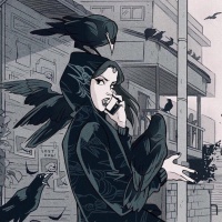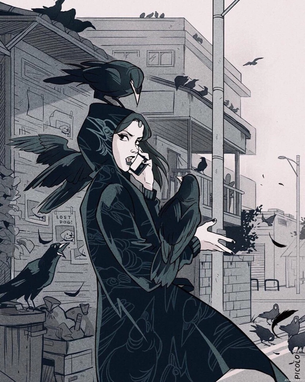 a concerned expression. Above her head, several birds are flying about, and the atmosphere suggests it might be raining, given