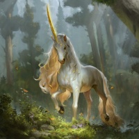 a fantasy scene featuring a unicorn, which is a mythical creature known for its magical horn. In this artistic representation, the unicorn stands majestically in what appears to be a forest or