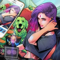 relaxed pose, sitting down and holding what looks like a smartphone or tablet in her hand. Behind her is a chaotic background filled with