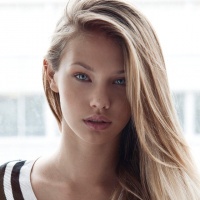 На картинке женщина со светлыми волосами смотрит прямо в камеру. На лице у нее нейтральное выражение, одета она в черный топ с белым или светлым полосатым узором вокруг выреза.