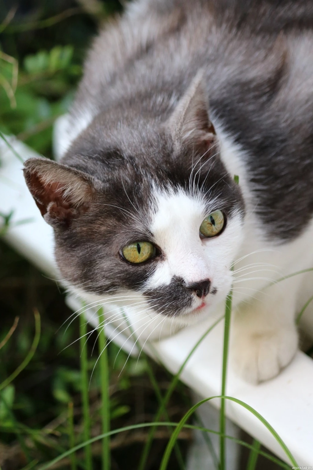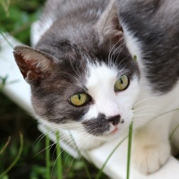 The image shows a cat. It has fur that appears to be grey and white, with markings typical of