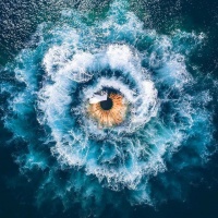 The image shows a circular wave or splash with the appearance of an eye in the center. The colors are vibrant with blues, greens, and whites, suggesting that it might be taken in the ocean. It's a creative representation of an eye within water.